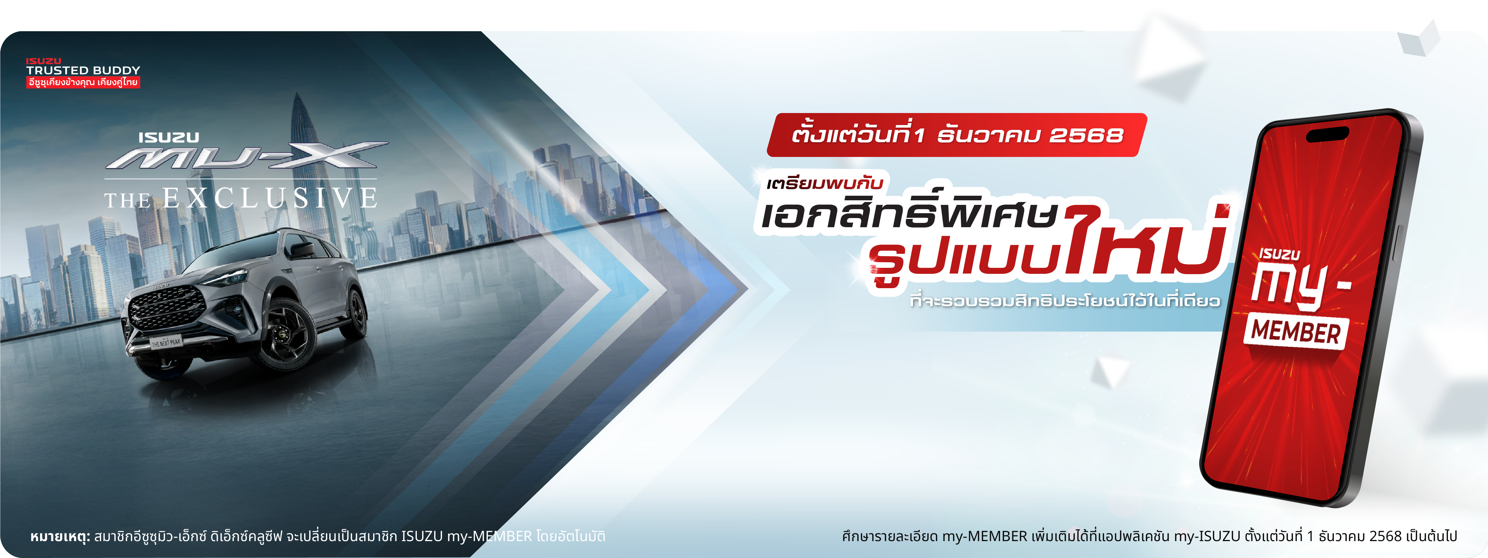 - ศึกษารายละเอียดโปรแกรมอีซูซุ มาย-เมมเบอร์ รูปแบบใหม่ เพิ่มเติมได้ที่แอปพลิเคชัน my-ISUZU ตั้งแต่วันที่ 1 ธันวาคม 2568 เป็นต้นไป